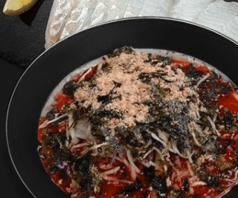녹진한 광어 숙성회와 쫄깃한 생면 국수의 특별한 조화 참기름 콩가루 김가루 들기름 고소한 고명이 듬뿍 없는 입맛도 살려주는 물회국수