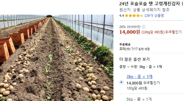 개진감자는 포슬포슬한 식감이 입안에서 사르르 녹는맛으로 꼼꼼하게 선별한 후 좋은 감자만 엄선하여 배송된다고합니다.