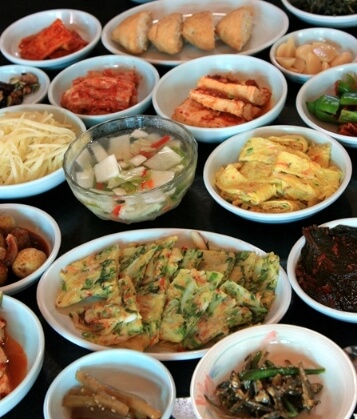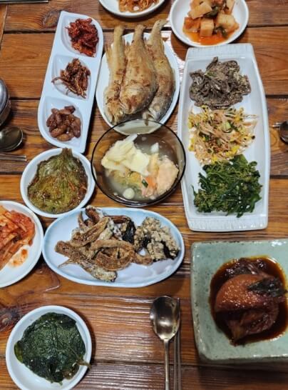 직접 산에서 캔 나물에 농사지은 채소로 아카시아꽃 튀김, 도토리묵, 머위장아찌등 계절마다 다르게 울긋불긋 조화로운 밥상