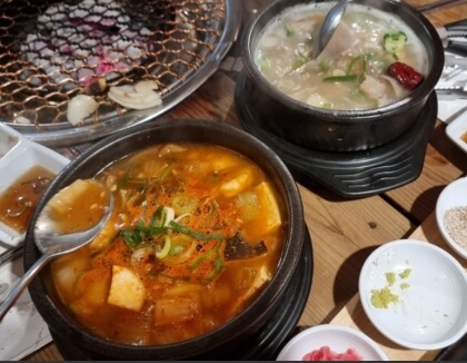 국물이 걸죽하며 진하기로 소문난 한우우족꼬리곰탕 한돈 암돼지 앞다리살과 목살, 삼겹살 부위가 듬뿍듬뿍 김치와의 조화가 일품인 돼지찌개