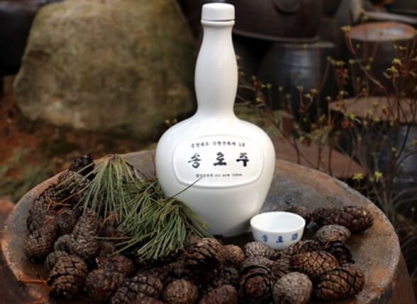 이 술의 제조법은 16세기쯤 지어진 고조리서(古調理書)에 기록돼 있으며 충청북도 무형문화재 제3호로 지정되어 있는데요. 보은송로주는 먼저 멥쌀가루로 죽을쑨 다음 전통방법으로 직접제조한 누룩을 섞어 사흘동안 발효시켜 밑술을 만들고 멥쌀과 구병산에서 나는 솔옹이마디(간솔)를 생률처럼 깍아넣고, 소나무 뿌리에 기생하는 복령과 엿기름을 함께 혼합한후 밑술을부어 발효시켜 이렇게 만든 약주를 베주머니에 넣고 짜서 맑게 거르면 송절주가 되는데 이것을 다시 증류하여 만드는 복잡하고도 전통적인 재래식 방법으로 약 200일간의 오랜 기간동안 장인의 정성으로 빚는 술입니다.
