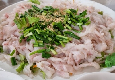 생가자미를 바로 썰어낸 것임에도 불구하고 씹는 맛이 좋은 가자미뼈째회 비린맛 전혀 없이 쫄깃쫄깃하고 시원한 식감