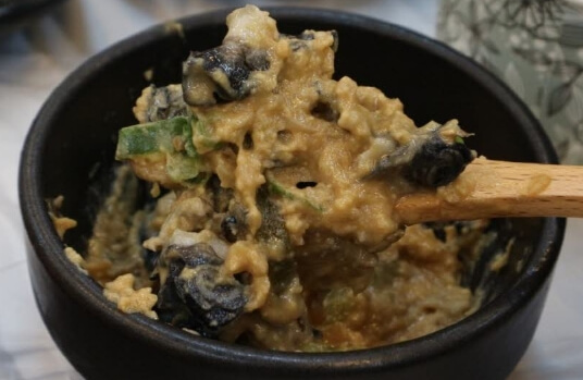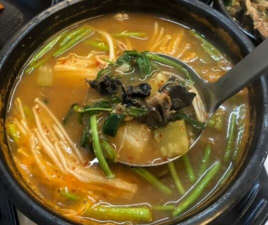 우렁강된장은 우렁이 가득 푸짐하게 들어간 우렁강된장으로 된장이라 짤 것 같은데 전혀 짜지 않아 맨밥에 비벼 먹어도 맛있을 것 같은 고소하고 쫀득하게 우렁 씹는 맛이 일품입니다