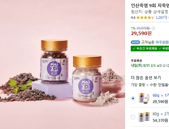 현재 별점 4.6점, 리뷰 902개를 가진 [정품] 인산가 인산죽염 9회죽염 고체(알갱이) 1kg, 1kg, 1개! 지금 쿠팡에서 더 저렴하고 다양한 구운소금 제품들을 확인해보세요.