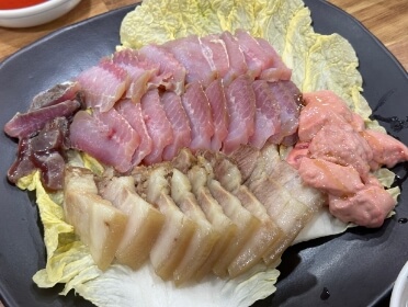 이곳의 홍어는 너무 과하지 않게 적당히 삭혀 홍어 입문자에게도 적당한 편이라고 하는데 고소함과 알싸함이 어우러진 홍어회에 잘 익은 묵은지 김치는 홍어삼합의 맛의 최고 포인트 정점을 이루어 주며 일단 오독오독한 홍어회만을 그대로 먹어보면 특유의 알싸하면서 고소한 맛이 입안에서 작렬한다고 합니다.