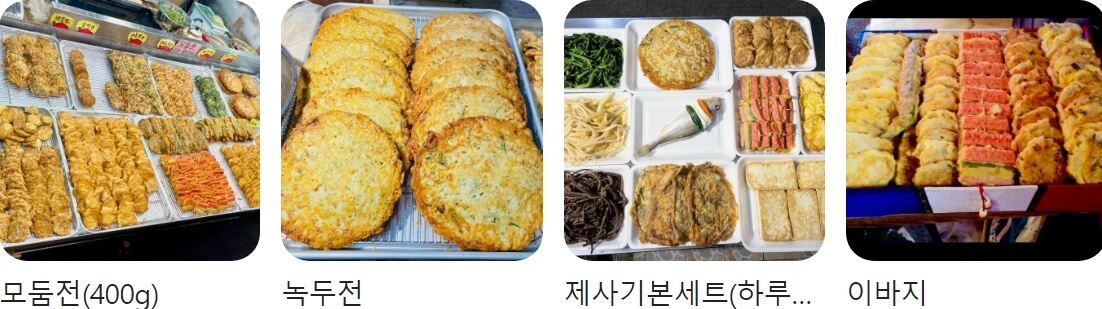 전의 종류 또한 워낙 다양해서 제사에 쓰이는 각종 전 이외에도 해물파전과 매콤새우전, 해물김치전 등등 명절 전에는 제사 기본 세트와 이바지 음식들도 판매하고 있으며 하루 전 예약이 필수라고 합니다.