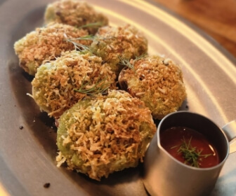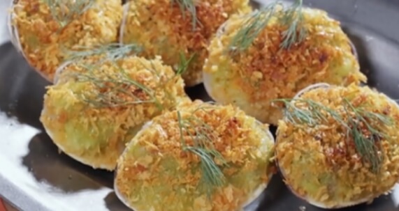 구운백합조개는 질 좋은 조개 위에 비법이 담긴 딜이라는 허브가 올라가 있어 조개 특유의 비린맛과 어우러지면서 복합적인 맛을 보여주는데 조개 한 알에 조개의 바다맛과 위에 올려진 빵 부스러기 그리고 구워진 맛이 다양하게 어우러집니다.