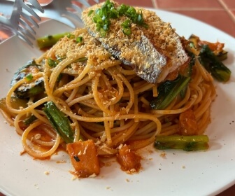 갈치가 얹어진 너무 독특한 갈치스파게티는 갈치속젓이 은은히 배어들어간 맛과 호박이 가득 들어가 있어 고소함과 짭짤함 등 다양한 맛이 조화롭게 복합적으로 어우러지는 맛으로 질 좋은 갈치 자체에 빵가루가 입혀져 단순히 구워 먹는 것보다 훨씬 더 촉촉하면서도 바삭한 맛이 어우러져 있다고 합니다.