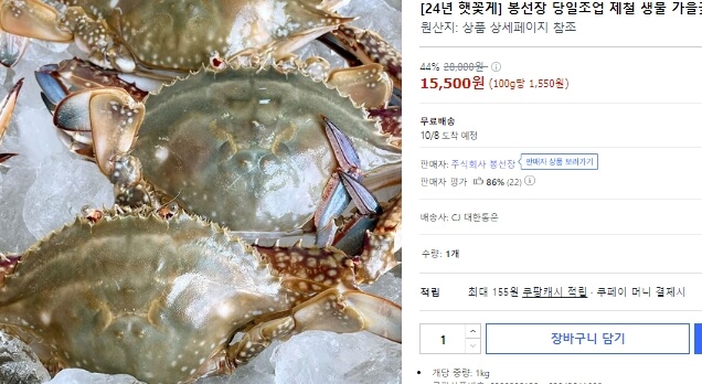 [24년 햇꽃게] 봉선장 당일조업 제철 생물 가을꽃게 1kg(3~5마리) - 꽃게 | 쿠팡