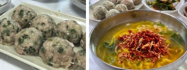 동네한바퀴 예천 닭고기의 풍미가 우러난 닭 한 마리 칼국수는 쫄깃한 면의 식감과 구수한 감칠맛 칼국수와 굴림만두는 다른 식당의 만두와는 완전히 다른데 피가 없이 채소와 고기로 가득 채운 속과 탱글탱글하고 쫄깃한 식감이 일품이라고 합니다.