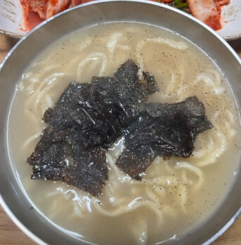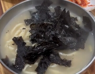 생김 칼국수는 단순한 모습으로, 김과 애호박외에는 내용물이 없어서 짐작이가지 않는 맛이지만 국물을 한 숟갈 떠먹어보면 사골 육수도 사골 육수지만 각종 풍미가 입안에 가득 퍼지며 찐맛집이라는 사실을 바로 알게 된다고 합니다.