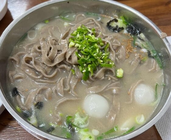 막국수는 물론이고 봉평메밀칼국수와 메밀만두국이 유명한데 팔팔끓인 사골육수와 함께 탱글탱글한 메밀면으로 메밀의 은은한 향과 사골육수와의 조합, 메밀만두까지 슴슴하면서도 구수한 메밀향이 국물에 배어 일반 칼국수보다 풍미가 깊은 맛을 느낄 수 있다고 합니다.