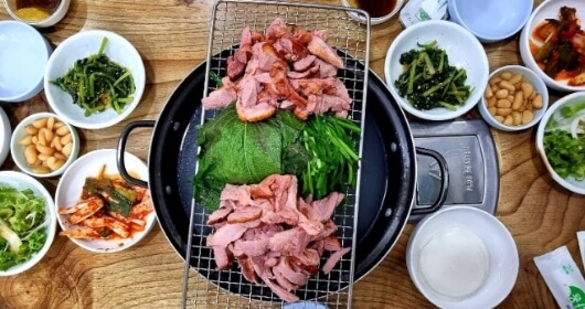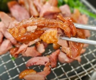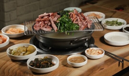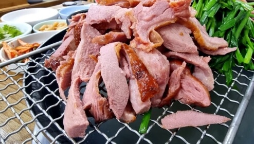 1차로 훈제되어 나오는 오리고기는 점점 수분이 빠지는 것을 방지하고자 밑에 육수가 끓어 오르면서 고기에 수분을 더해주고, 부드럽고 촉촉한 오리고기에 역시 부드러운 깻잎과 부추를 싸먹으면 맛도 영양도 일품이라고 합니다.