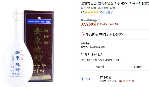 국내산쌀과 누룩만 사용하여 명인의 전통비법으로 빚은 안동소주로 45%의 높은 도수에도 불구하고 은은한 향취와 감칠맛이 좋고 목넘김이 부드러우며 오래 보관할수록 풍미가 더욱 좋아진다고 합니다.