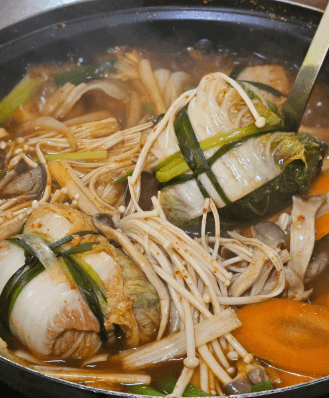 비법이 담긴 깊은 육수에 얼큰한 양념과 여러 가지 채소와, 버섯을 듬뿍 넣은 전골은 김치말이, 만두, 칼국수 등 어떤 재료와도 잘 어울리고 한 입 먹었을 때 입안 가득 풍성함을 느낄 수 있습니다.