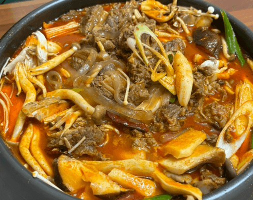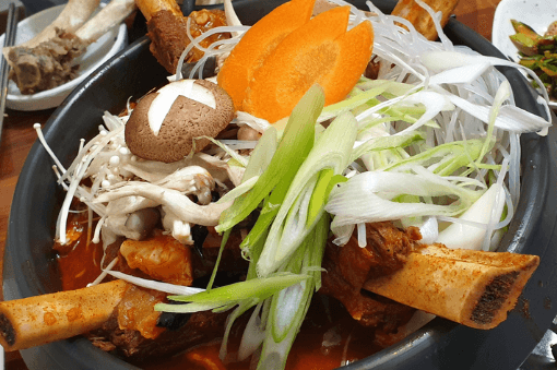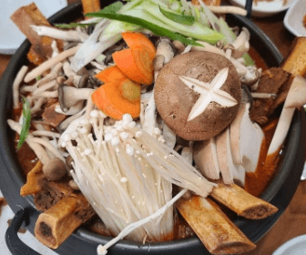 표고버섯, 새송이 버섯, 팽이버섯 등을 비롯해 각종 야채가 듬뿍 들어가고 무엇보다 왕갈빗대가 군침을 삼키게하는 비주얼을 뽐내는데요. 졸이고 먹을수록 점점 매콤해지면서 먹을수록 맛도 점점 맛있어지며 부드러운 소갈비와 다양한 채소 등으로 구성되어 있어 다채로운 맛의 향연을 즐길 수 있고 한번 먹으면 중독되는 매운 갈비찜이라고합니다.