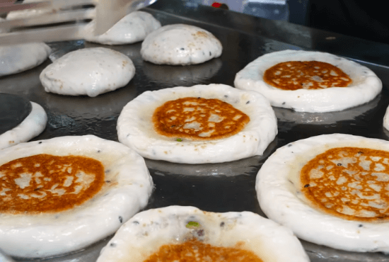 동그란 호떡 반죽을 누르개로 한번 뽁! 눌러 공중에 떠오르게 한 뒤, 순식간에 뒤집는다!
