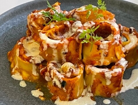 비프 웰링텅은 소고기에 뒥셀을 바르고 크레페, 퍼프페이스트리 반죽을 입혀 오븐에 구운 영국 요리로 1815년 워털루 전쟁에서 나폴레옹을 상대로 승리했던 전쟁영웅 웰링턴 공작의 이름을 따서 만든 요리라고 하는데요. 다양한 재료와 손질은 물론이고 페이스트리 반죽을 손으로 만들기 위해서는 상당한 시간과 기술이 필요해 손이 많이 가기때문에 다른곳에서는 쉽게 맛보기 힘든 요리라고합니다. 존재 자체만 해도 SNS를 핫하게 만드는 미슐랭 3인방이 자신 있게 내놓은 비프웰링턴 스테이크는 다년간 현장에서 쌓아온 경험을 바탕으로 다양한 아이디어와 요리의 기본이 되는 식재료들로 쉽게 접하기 힘들었던 클래식한 메뉴를 국가대표 셰프 3인방만의 스타일로 보다 깊이 있고 대중적인 메뉴로 탄생시켰다고합니다. 또한 부드러운 감자뇨끼와 버섯크림라자냐 피스타치오 파스타 토마토 샐러드 등 비프웰링턴 스테이크와 함께 곁들여 함께 먹는 메뉴로 인기라고합니다.