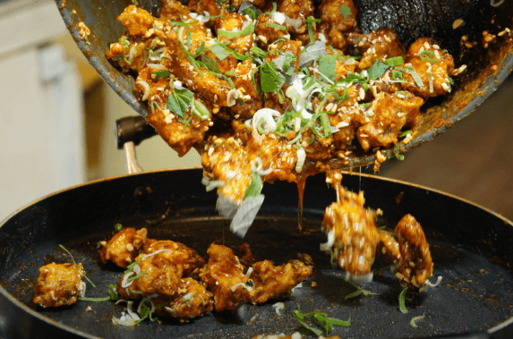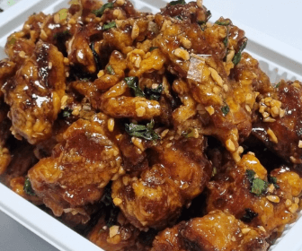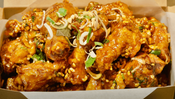 깻잎 토핑의 닭강정으로 달콤한 맛과 매콤한 맛으로 선택할 수 있으며 특히 매콤한 맛이 중독성을 일으키는맛이라고 합니다.
