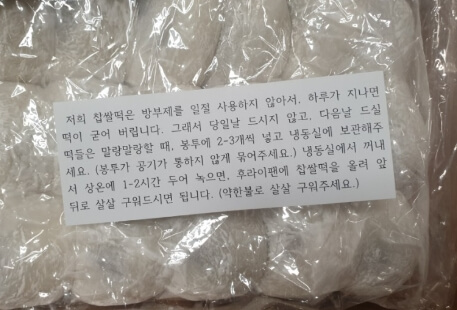 달인의 찹쌀떡은 하루만 지나도 쉽게 떡이 굳어 버리기 때문에 바로 먹거나 남은 떡은 봉투에 2, 3개를 넣어 냉동실에 보관해 두었다가 먹을 때는 적당히 해동한 이후 후라이팬에 찹쌀떡을 올려 양면을 살짝만 구워서 먹는 것을 추천한다고 합니다.