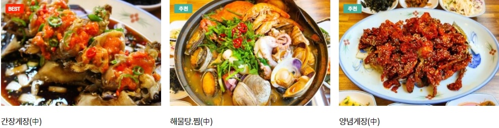 이곳의 꽃게범벅은 살아있는 싱싱한 서해안 꽃게만을 매일 제공받아 그 중에서 살이 많은 수게만을 사용해서 두툼하고 촉촉한 꽃게살과의 양념의 조화로운 맛이 일품이라고 하는데요. 또한 서산에서 매일 공수해 알이 꽉찬 암게에 당귀, 엄나무, 오미자 등 각종 약재를 달인 간장소스로 만든 간장게장이 가장 인기있는 메뉴라고 합니다.