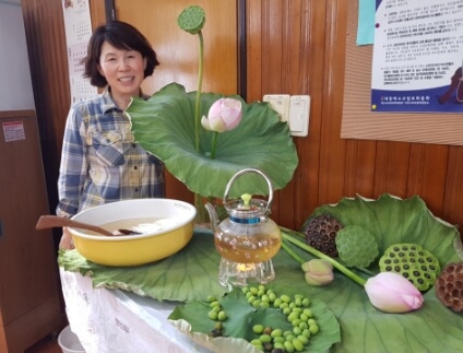 이번 연잎은 무더위로 지친 심신을 안정시키고 식욕을 돋구어주고 갈증을 없애는 효능이 있어 대표적인 여름 약재로 사용되어 왔는데 비타민C 와 식이섬유가 풍부하며 다량이 철분이 함유되어 있으며 연잎으로 돼지고기에 싸먹으면 돼지고기의 포화지방을 스펀지처럼 흡착시켜 몸 밖으로 배출하기 때문에 맛은 물론 건강의 효능도 뛰어나다고 합니다.연잎차는 녹차에 비해 떫은맛을 내는 타닌 성분이 적고 카페인 성분도 녹차의 13분의 1수준이라 어린이나 노약자가 먹기에 부담에 없으며 연근은 진흙 속의 보물로 불릴만큼 건강에 좋은 성분이 가득한것으로 잘알려져있습니다.