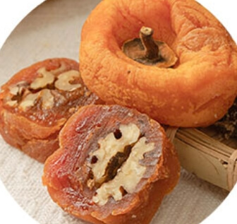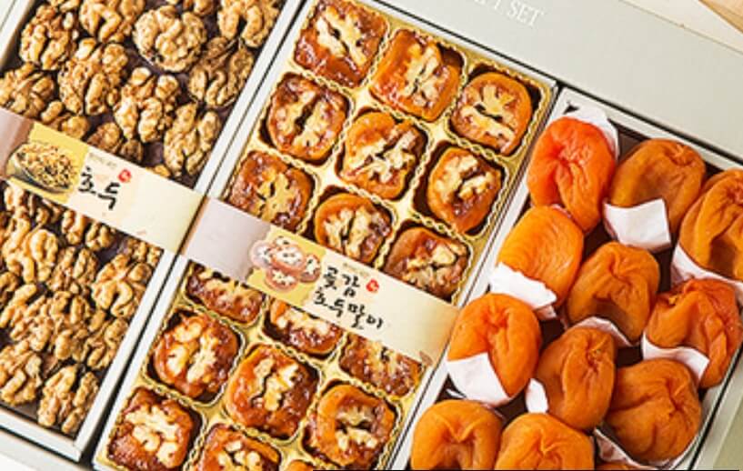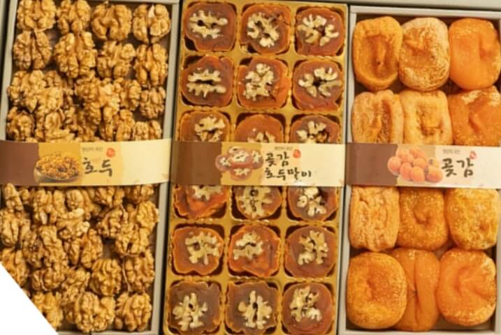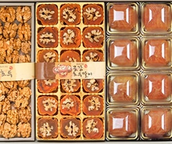 호두는 유일하게 인간의 뇌를 닮은 식품으로 단백질 철 나이아산 비타민 B1 B2 B6 E 등 몸에 좋은 영양소가 가득 들어 있어 있으며 곶감의 씨를 제거하고 얇게 펴서 안에 호두를 넣고 썰어낸 곶감 호두말이는 예로부터 임금님께 진상하던 고급 간식 별미 간식 선물로도 인기라고 합니다.