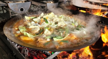 처음부터 끝까지 참나무장작과 숯불로 끓여내는 깔끔하고 깊은 국물맛의 솥뚜껑닭볶음탕의 맛