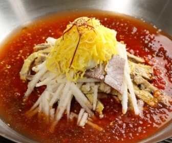 비빔냉면 해산물육수에 국내산 고춧가루 과일 야채로 국내 유일의 이곳만의 비법