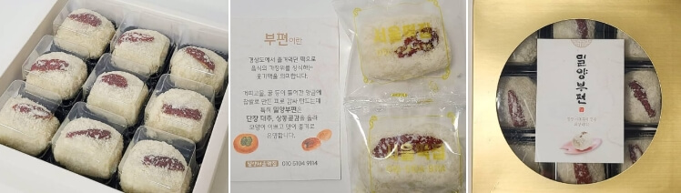 시장상인들도 맛을 인정한 떡집으로 밀양부편은 찹쌀 피에 거피고물, 대추 곶감 고명으로 예쁘고 쫀득쫀득한 식감과 담백하면서 고소한 맛으로 유명하며 달콤 고소한 깨송편도 인기라고 하는데 시장사람들 밀양아리랑시장떡집 택배 주문은 하단에서 확인 가능합니다.