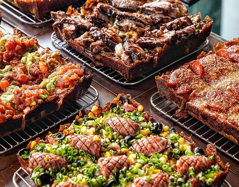 겉은 크리스피한 과자처럼 바사삭하고 속은 구름처럼 촉촉한 피자빵위에 우대갈비, 갈릭쉬림프, 스테이크 등 찐맛요리를 토핑으로 탑을 쌓은 서민갑부의 디트로이트 사각피자 택배 주문은 아래에서 확인하세요.