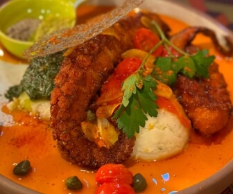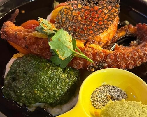 신선한 페스토와 매콤한 브라바 소스를 뿌린 매쉬드 포테이토 위에 통통한 문어 다리