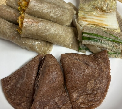 메밀전병 국산 배추로 만든 김치와 구수하고 담백한 돼지고기와 믿을 수 있는 재료로 꽉 채운 강