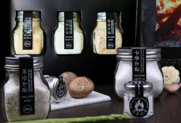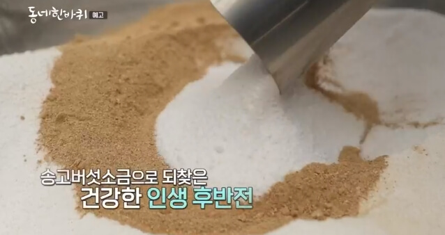 동네한바퀴 충북 단양 전통황토가마에서는 100% 전남 신안 비금도에서 추출한 천일염을 3~4년 자연 건조를 통해 간수를 제거한 후 전통 황토장작가마에서 800℃ 이상 의 고온에서 참나무와 소나무를 연료로 사용하여 14시간 이상 구워 순수 구운 소금을 만든다고하는데요. 중금속을 포함한 불순물과 간수,박테리아가 없으며 쓴맛이 없고 짠맛이 덜하여 섭취한 후 입안에서 단맛의 여운이 남는 800℃ 열기를 견딘 인고의 산물인 구운소금을 만든다고 합니다. 소금 굽는 과정의 복사열로 구워낸 마늘을 소금과 일정 비율로 섞어 단양마늘소금을 만들며 송이의 그윽한 향과 고기처럼 쫄깃한 식감을 지닌 귀한 송고버섯을 구워낸 버섯소금은 맛과 향이 탁월하며 진한 육수로 요리한것같은 풍미를 주며 감칠맛이 매우 뛰어나 각종 나물이나 다양한 요리에도 감칠맛을 배가 시켜준다고합니다.