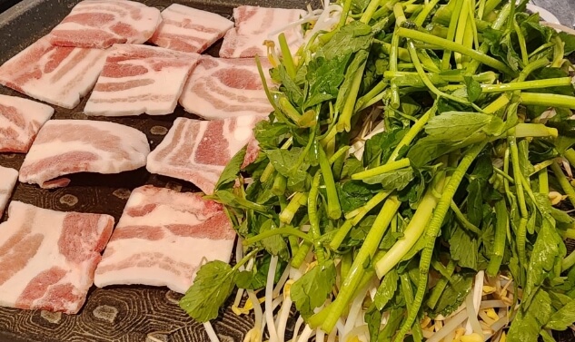 불판 위에 아주 살짝만 구워 아삭함을 살리는 것이 달인의 냉삼겹 철학.