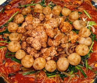 대창의 고소한 기름이 아귀찜의 매콤한 양념을 만나 최고의 감칠맛을 내는 대창아구찜은 바다와 육지의 이색적인 만남으로 빠져들 수밖에 없는 매력의 한우대창 아구찜